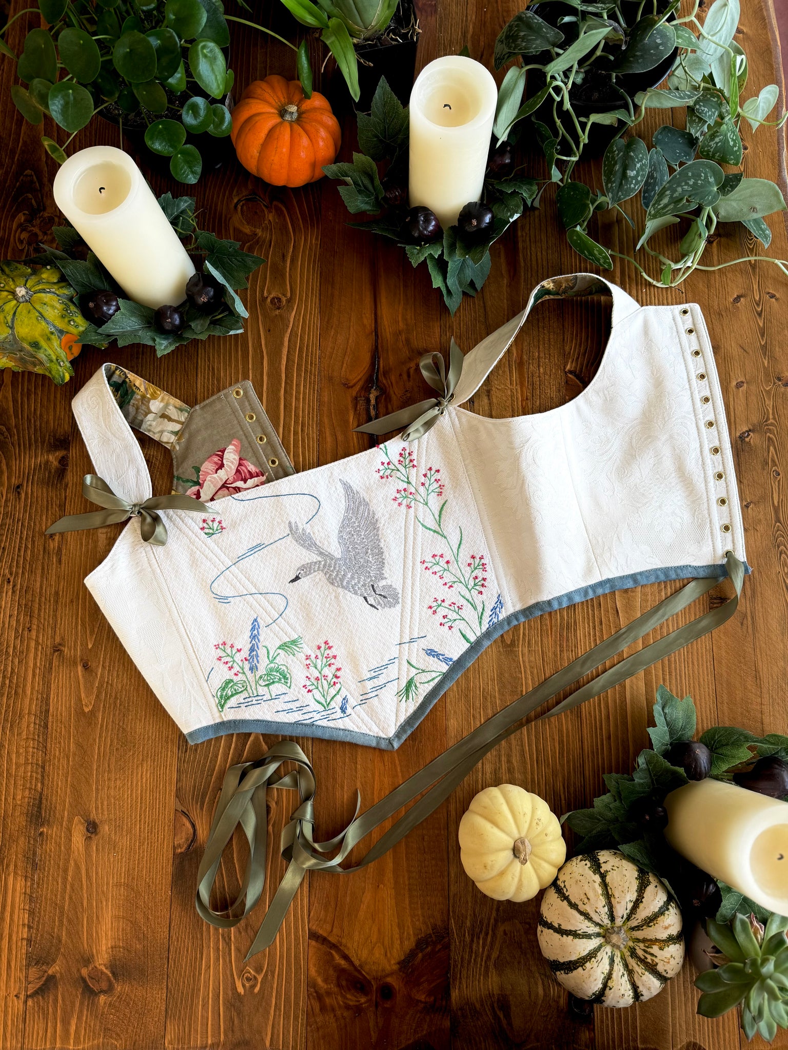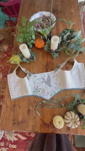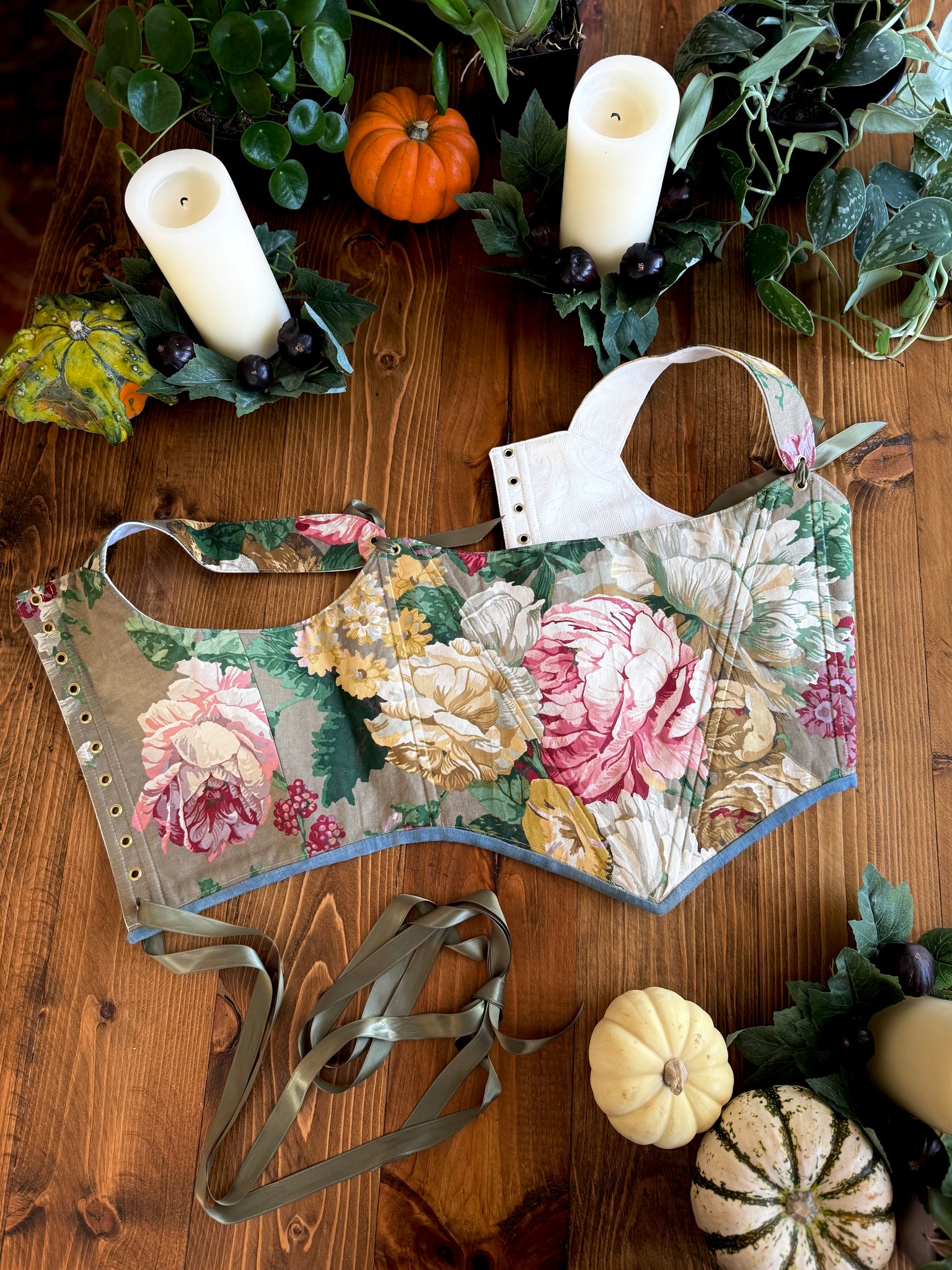 Preorder exquisite back lacing stays cut from a vintage embroidered panel. Can be made in any size. Lined with vintage floral print cotton, fully reversible. Block printed logo. Indigo dyed linen binding on the waist. The stays are stiffened with synthetic whalebone and close with gold colored grommets. Adjustable straps.