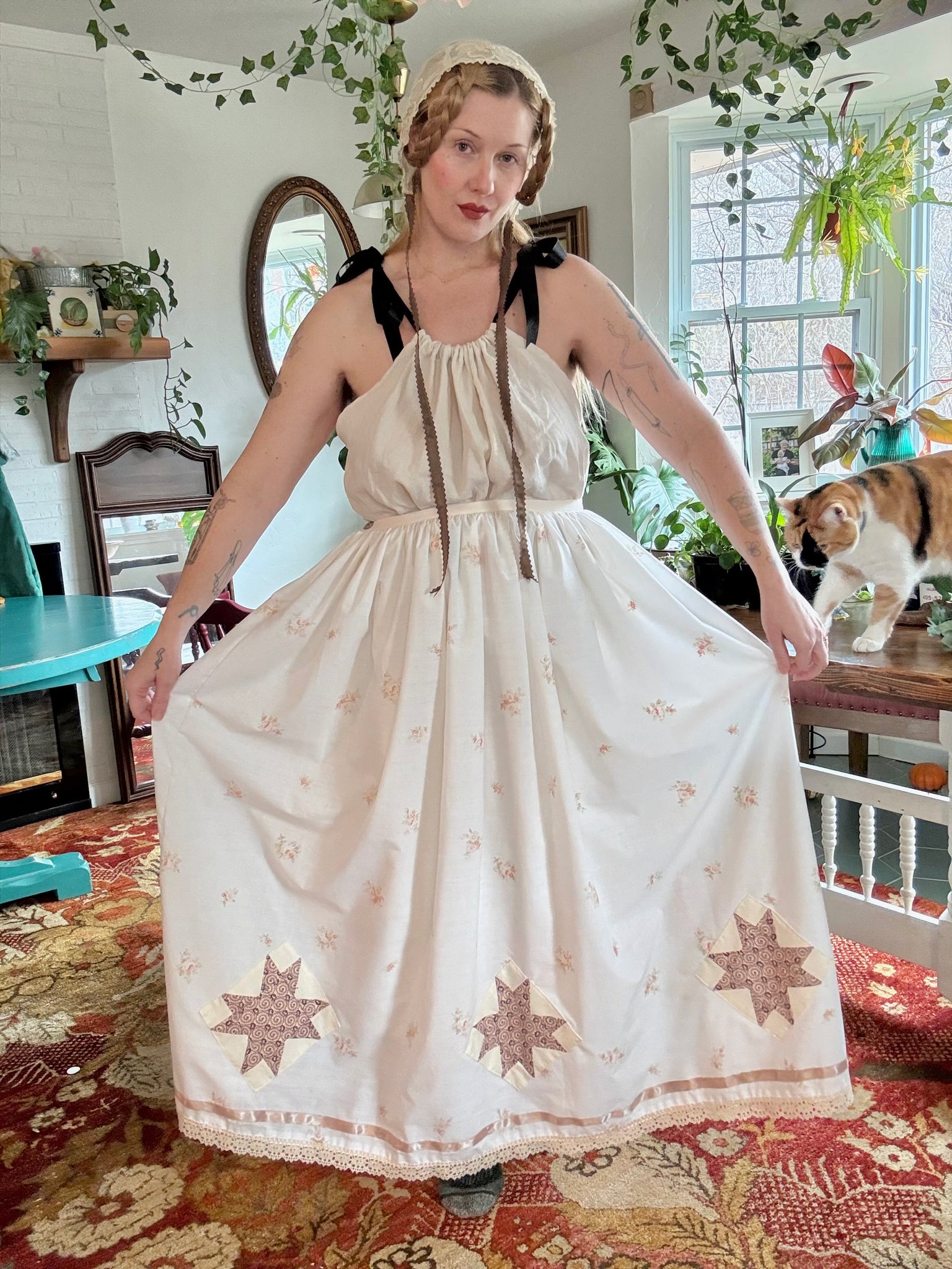 Vintage Cotton rose print petticoat with vintage star quilt blocks, satin ribbon and cotton lace trim. Waistband closes with a shell button and is 34”. Skirt is 39” long with an 108” circumference. Block printed HAG logo in white on white linen.