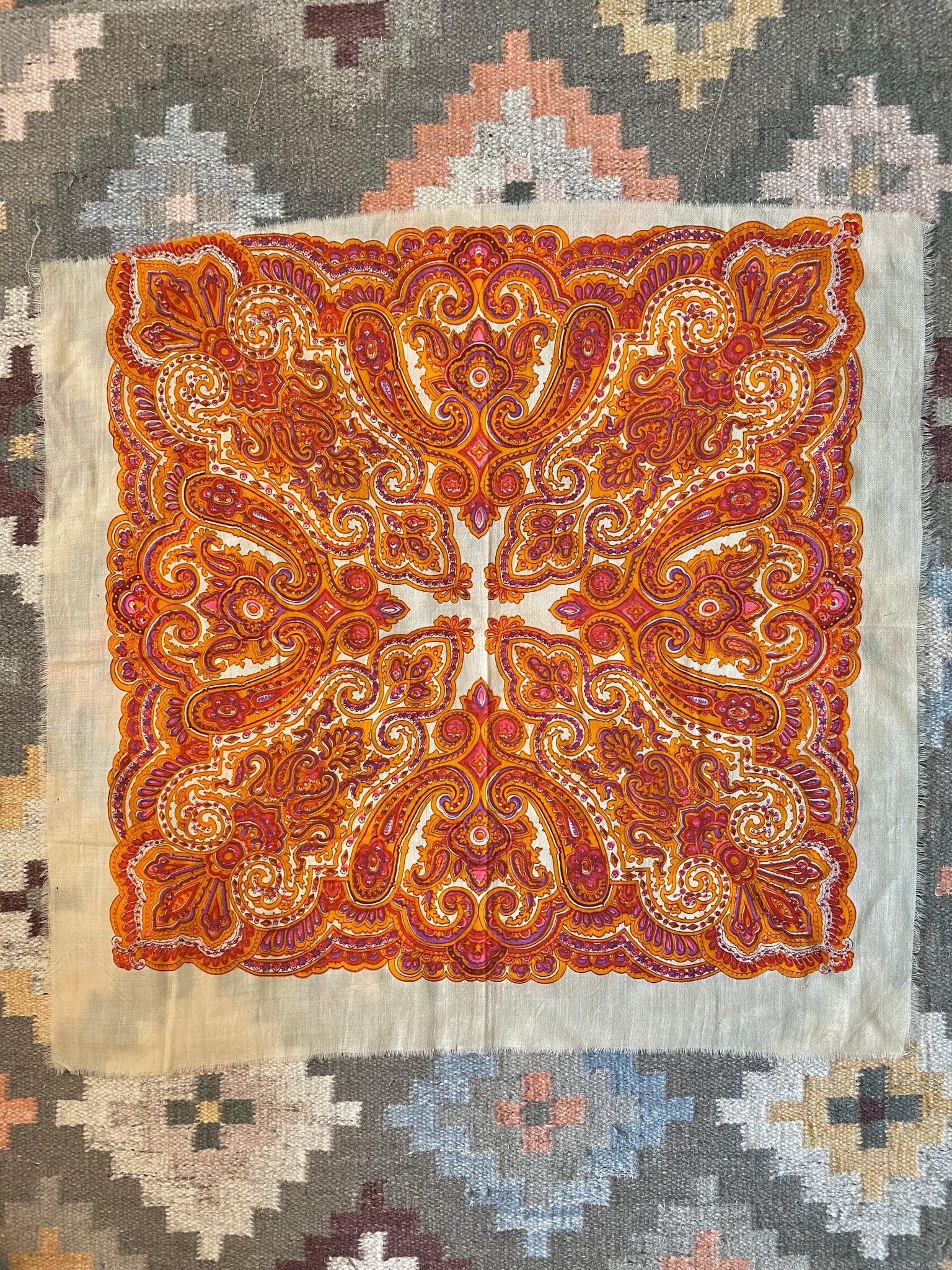 Vintage wool pavlovo posad scarf featuring orange paisley designs. Measures 33” by 33”. Slightly uneven printing adds to the folk charm of this piece.