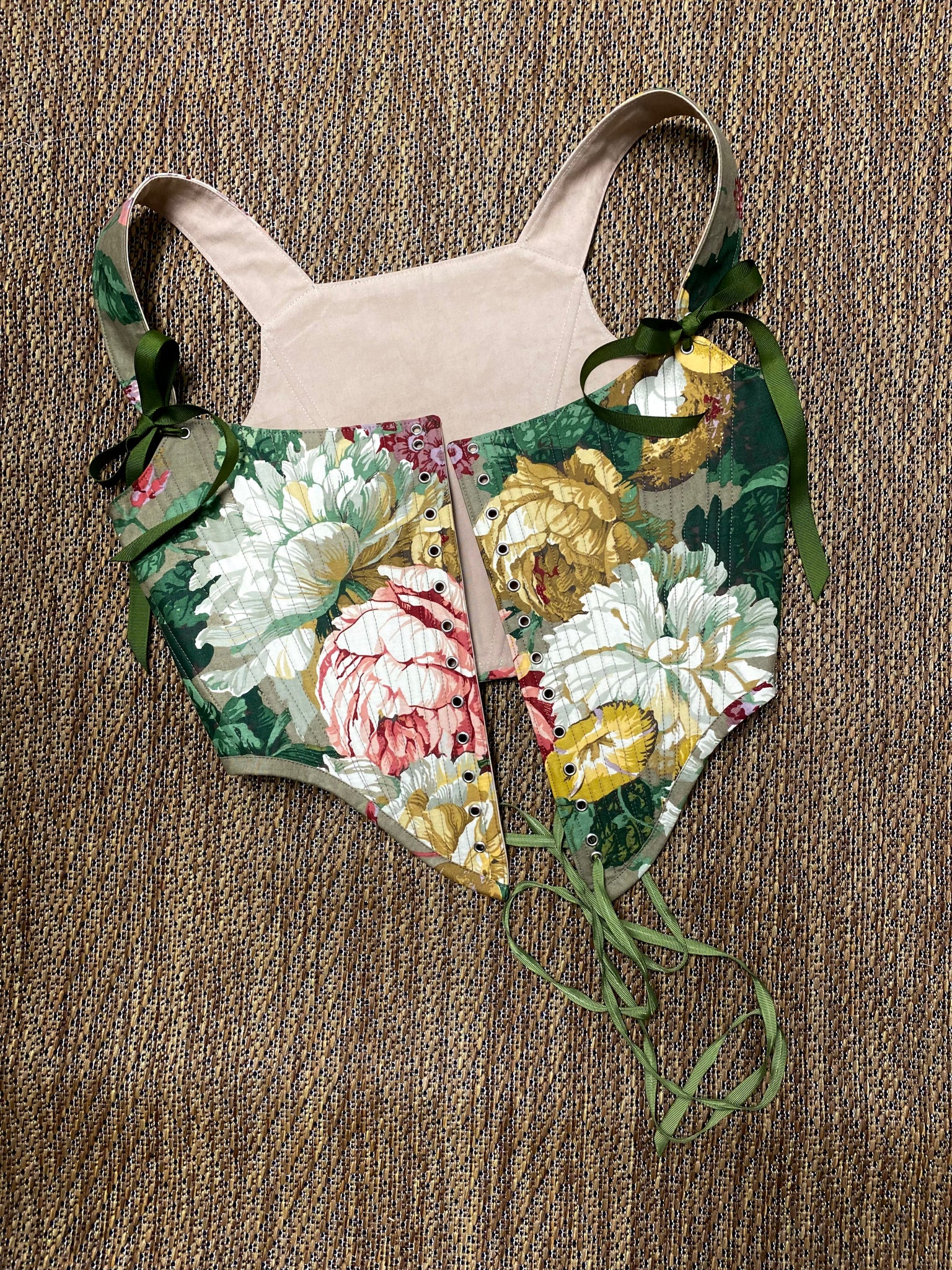 Front lacing floral stays in plain cloth (tbd) with tabs 💚🌻